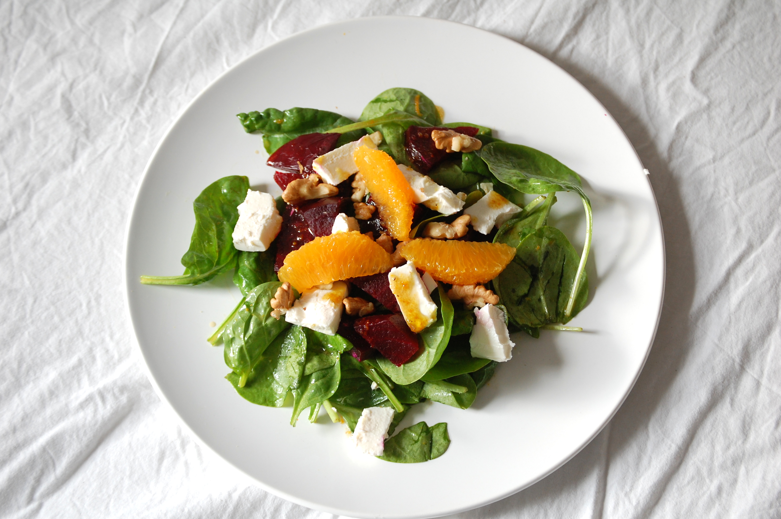 Do zrobienia tej sałatki zainspirowała mnie zawartość mojej lodówki. Od jakiegoś czasu mieszkałam tam sobie dwa buraki, część opakowania szpinaku pozostałą po koktajlu. W zasięgu ręki były też orzechy włoskie prosto z naszego drzewa. Wystarczyło dokupić fetę, która jest doskonałym towarzystwem zarówno dla buraka jak i szpinaku. Po połączeniu tego z dressingiem zrobionym z miodu, musztardy Dijon (lub innej ostrej), skórki startej z pomarańczy, octu balsamicznego i oliwy z oliwek utworzyło zaskakująco smaczną całość. Jest to doskonała propozycja dla koneserów lekkich kolorowych sałat i niecodziennych połączeń smakowych.