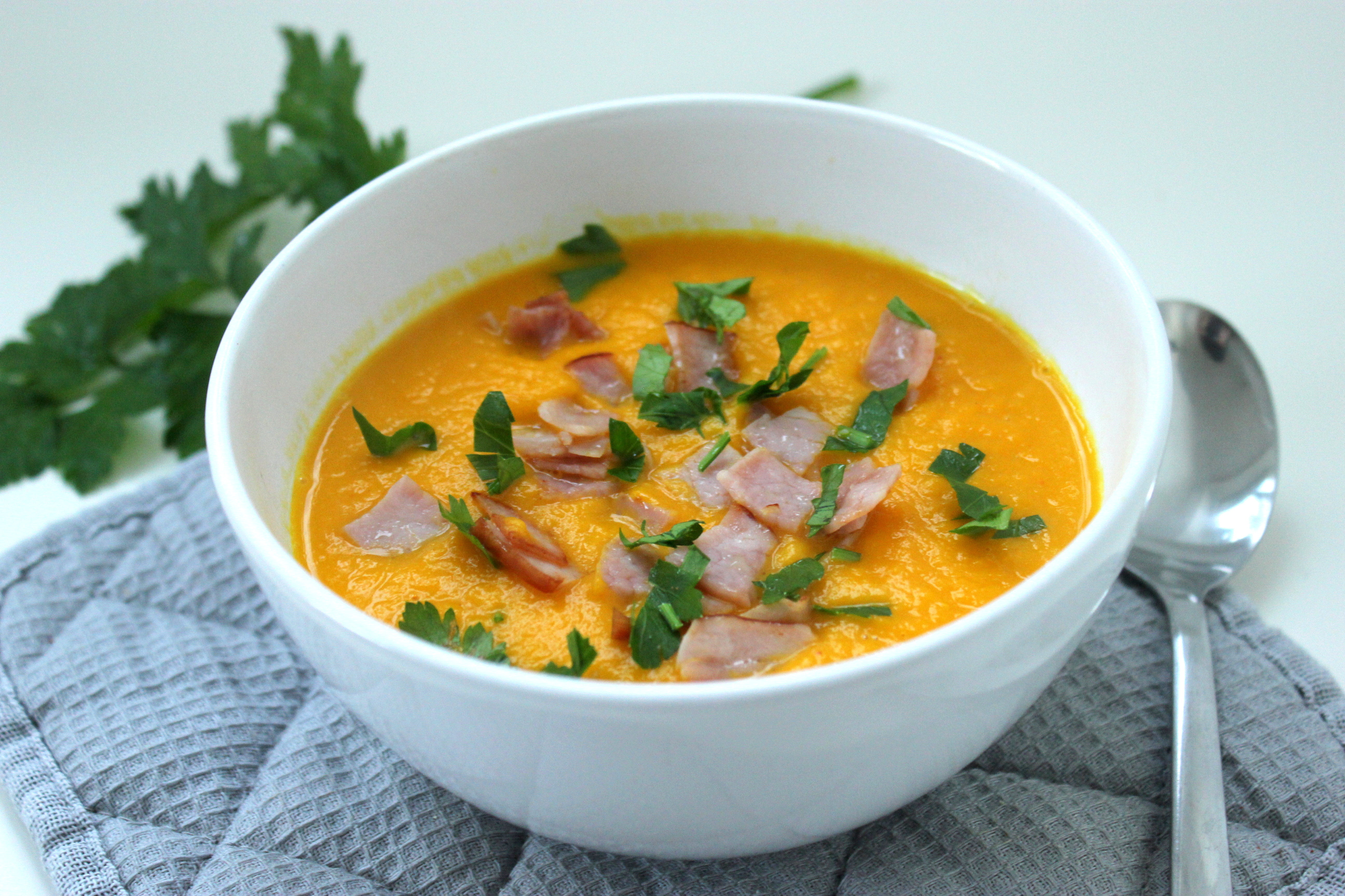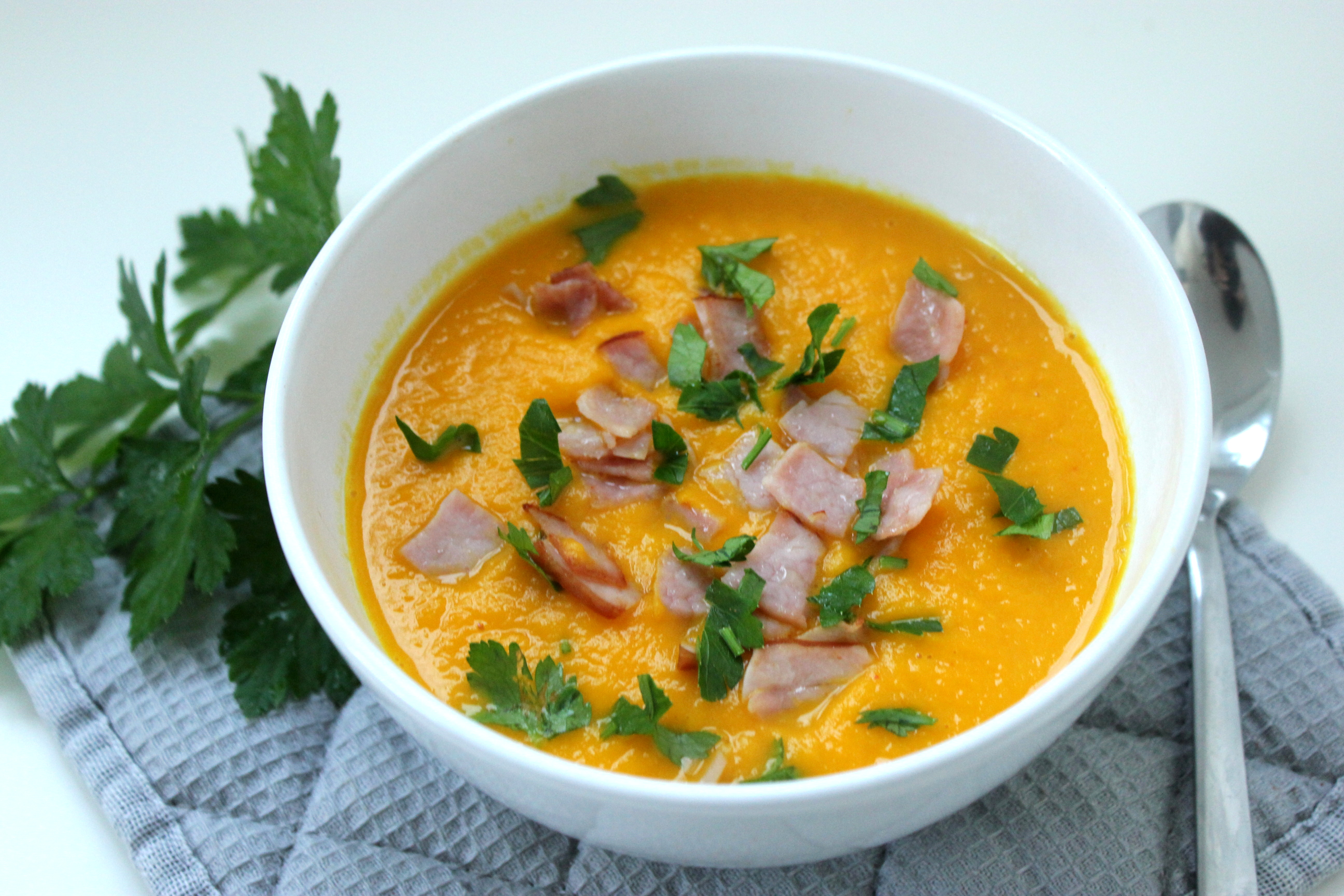- Wlewamy zupę do naczynia i dekorujemy kawałkami szynki i natką pietruszki. Doskonale sprawdzą się także migdały pokrojone w słupki, orzechy włoskie lub podprażone pestki dyni.