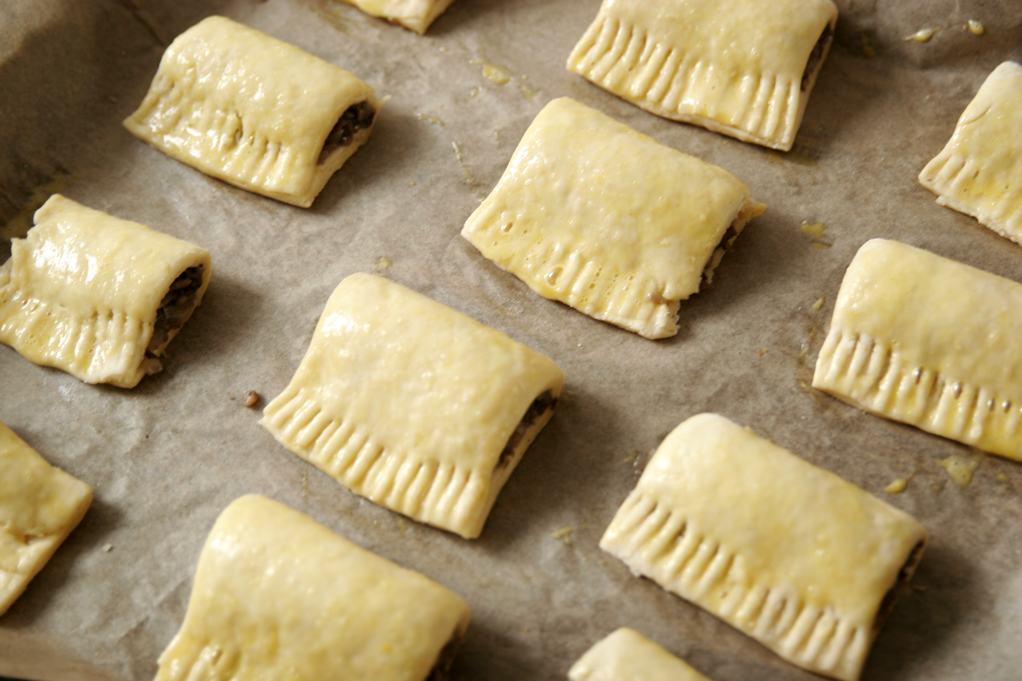 - Uformowane paszteciki smarujemy rozmąconym jajkiem.