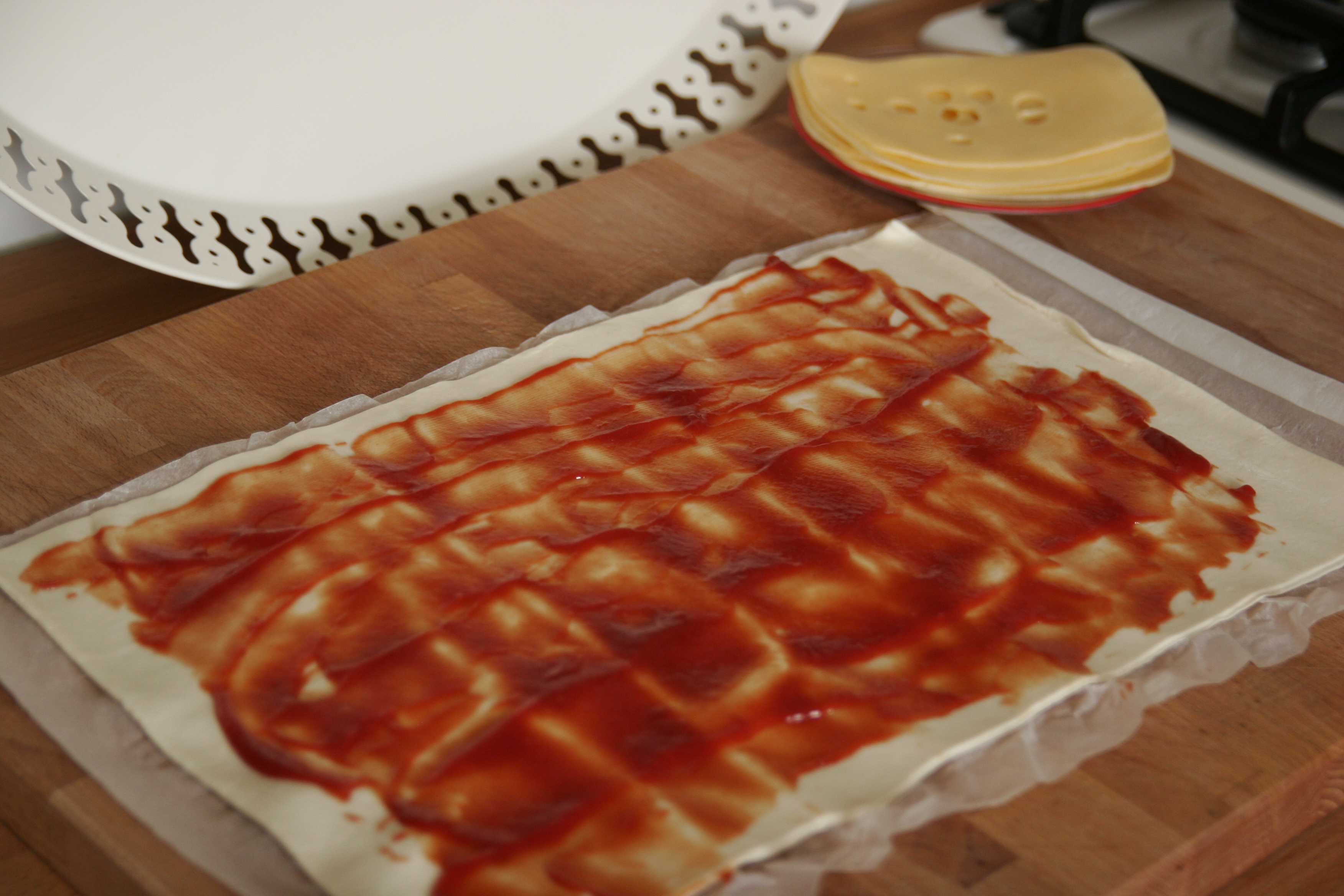 1. Ciasto francuskie rozkładamy na blacie i przesmarowujemy keczupem pomijając brzegi i posypujemy ziołami np. bazylią, tymiankiem. Nie używajcie zbyt dużo keczupu, bo w czasie pieczenia wypłynie i się spiecze.