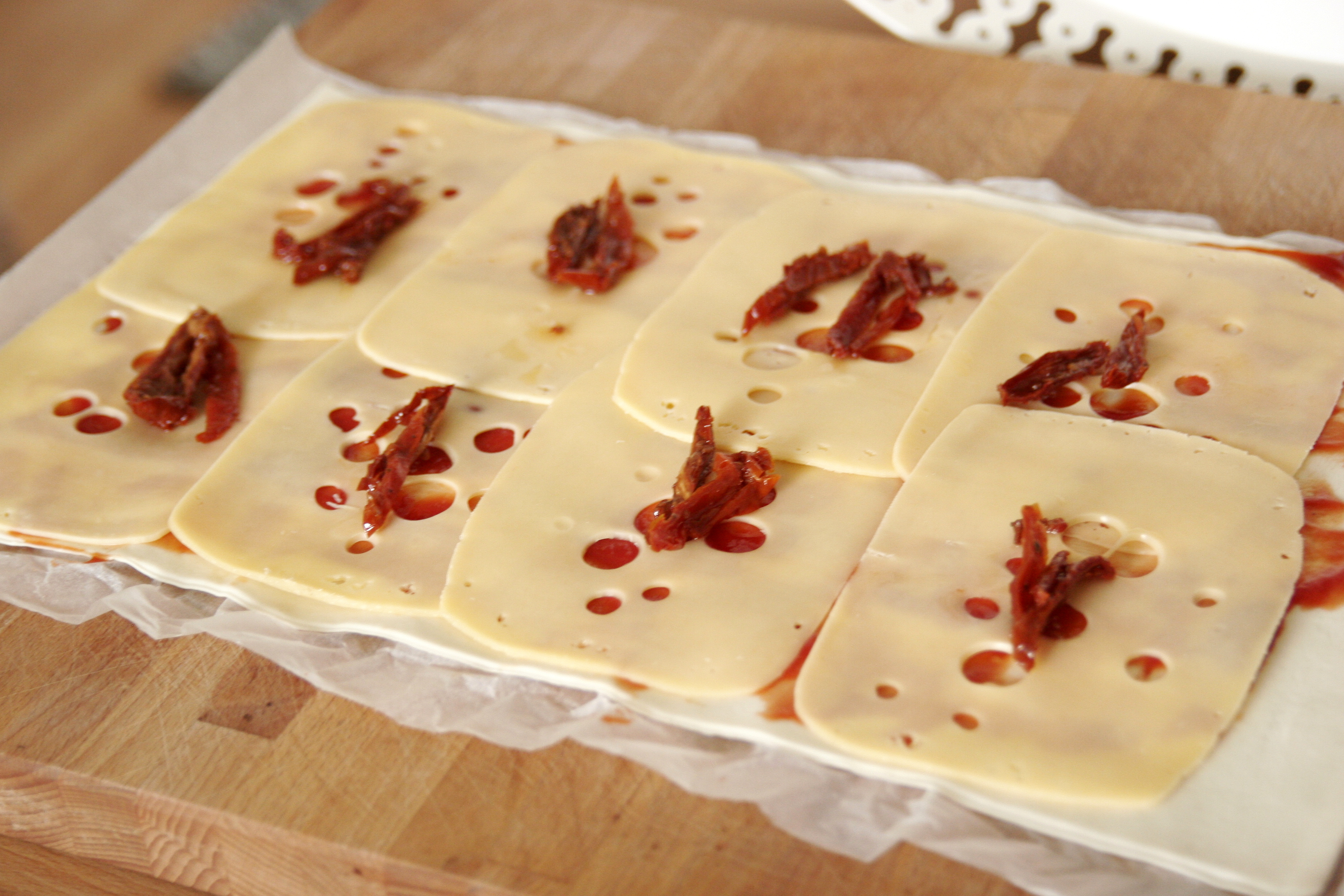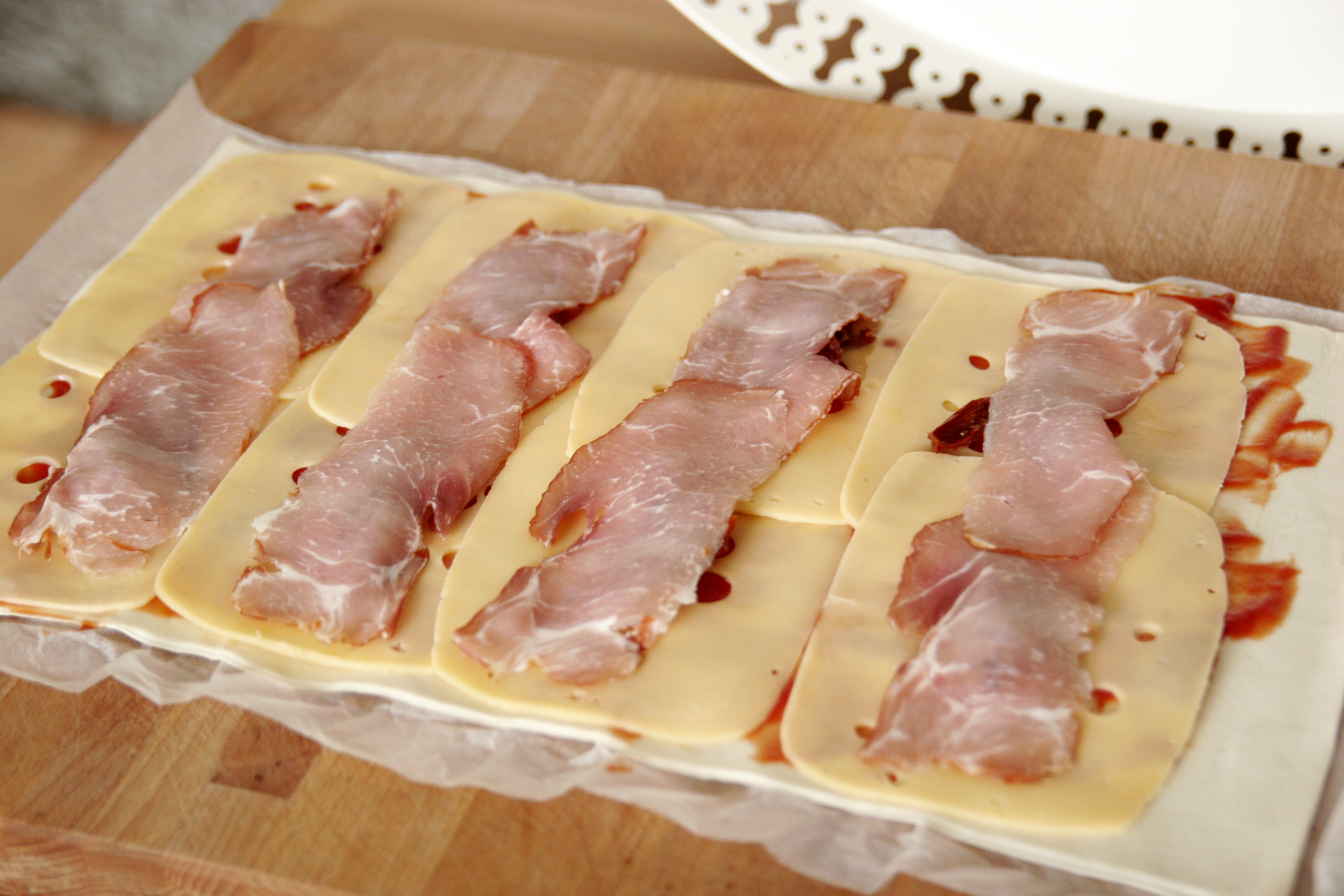 3. Na ser kładziemy szynkę i ewentualnie inne dodatki (nie za wiele, gdyż wypadną w czasie krojenia).