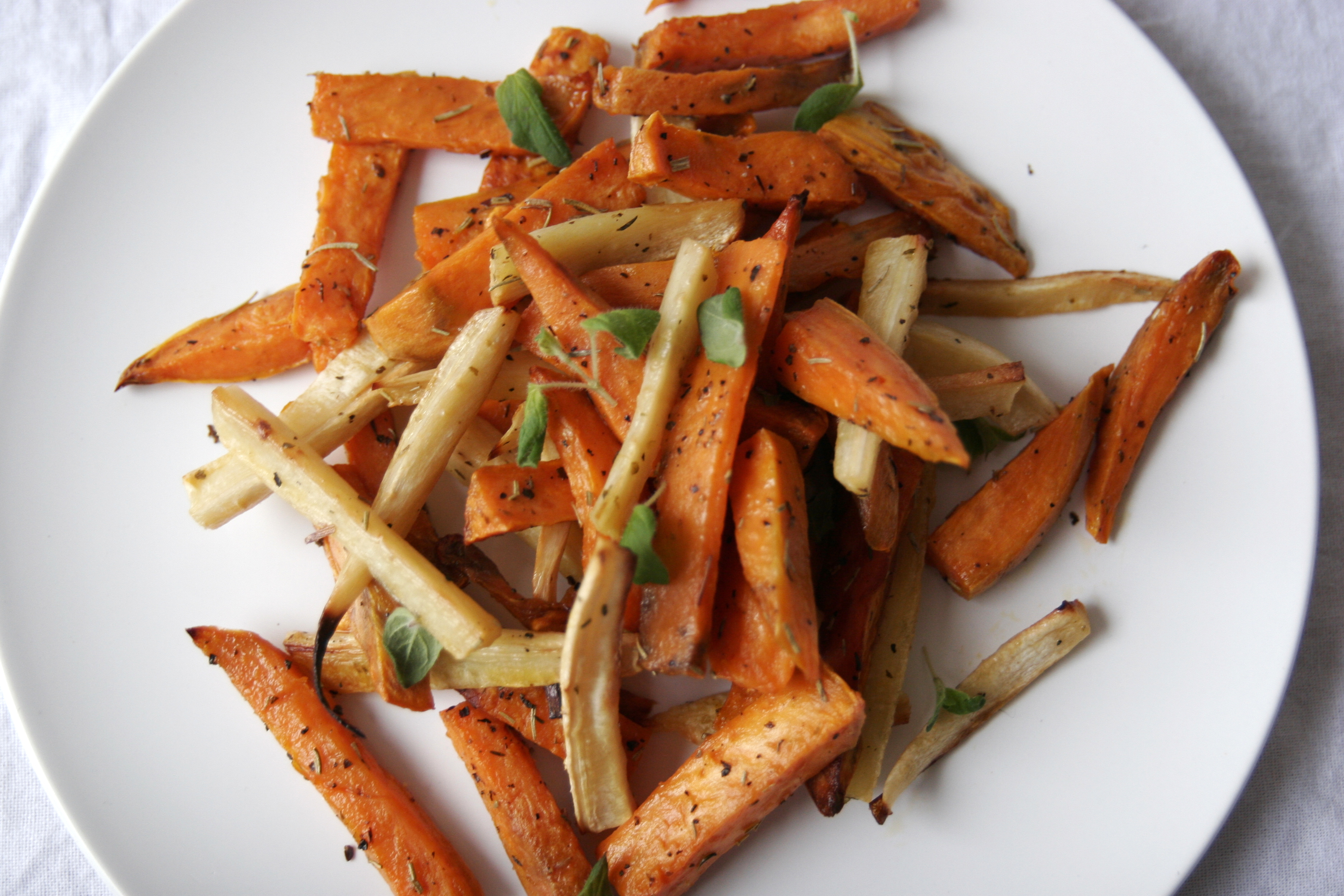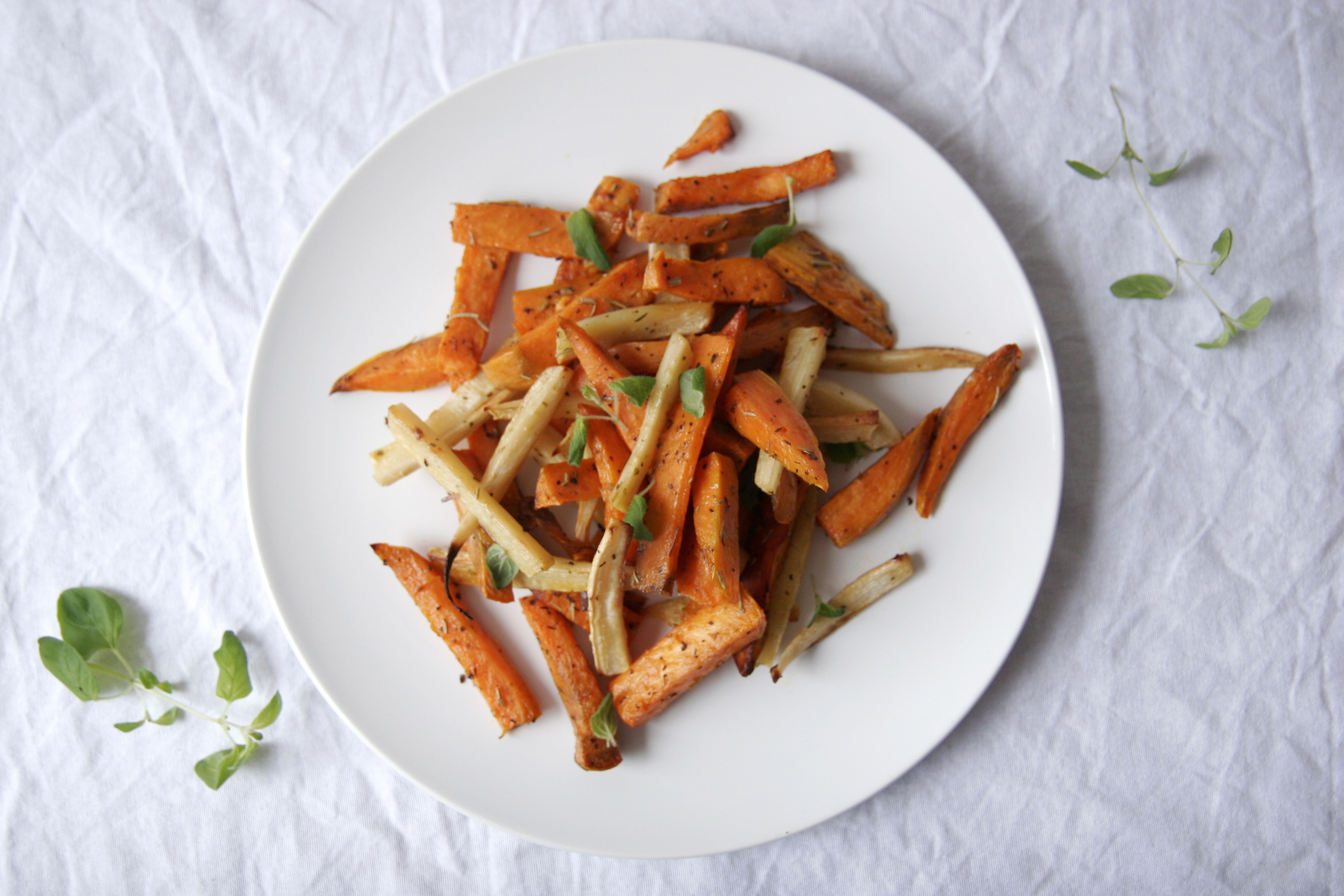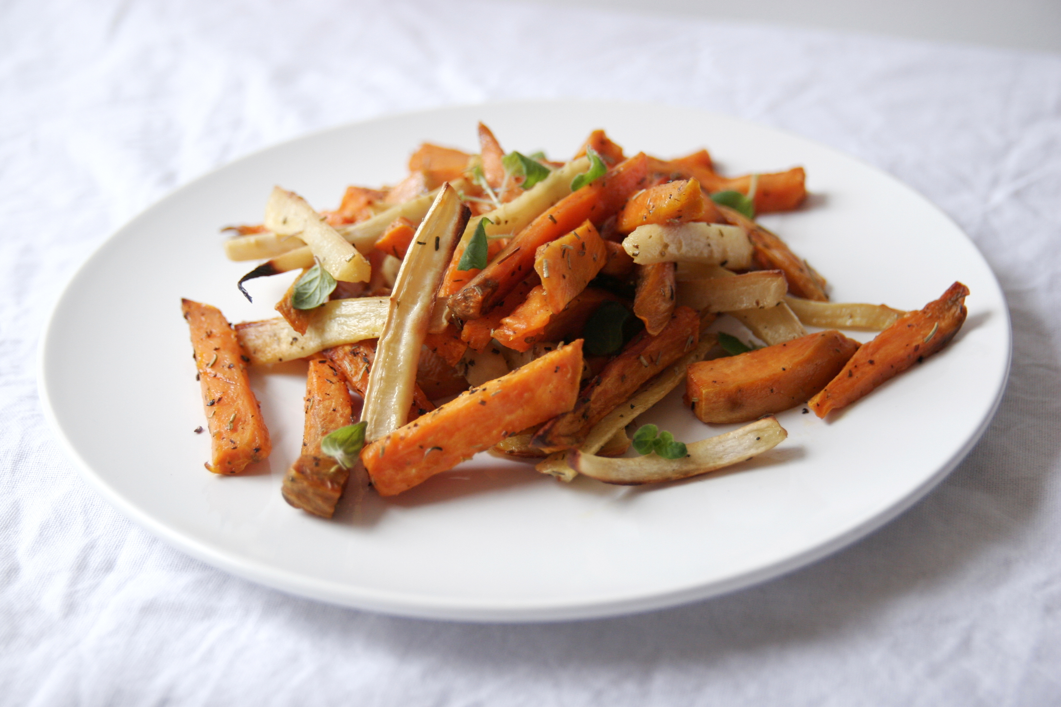 Frytki z batatów jadałam już kilkukrotnie i wiem, że to doskonały dodatek do dań i zamiennik ziemniaków. Jednak dopiero ostatnio na jednej ze smacznych urodzinowych kolacji u pewnej Natalii miałam okazje posmakować je w towarzystwie frytek z korzenia pietruszki. Muszę przyznać, że nie przepadam za tą częścią pietruszki i z tego powodu była ona dla mnie dotychczas tylko warzywem nadającym się na wywar. Po raz kolejny przekonałam się, że uprzedzenia mogą mocno ograniczyć nasze kulinarne eksperymenty, bo pietruszka w postaci frytek otoczona ziołami smakuje nieziemsko i chyba nawet przyćmiła trochę egzotyczne słodkie ziemniaki.