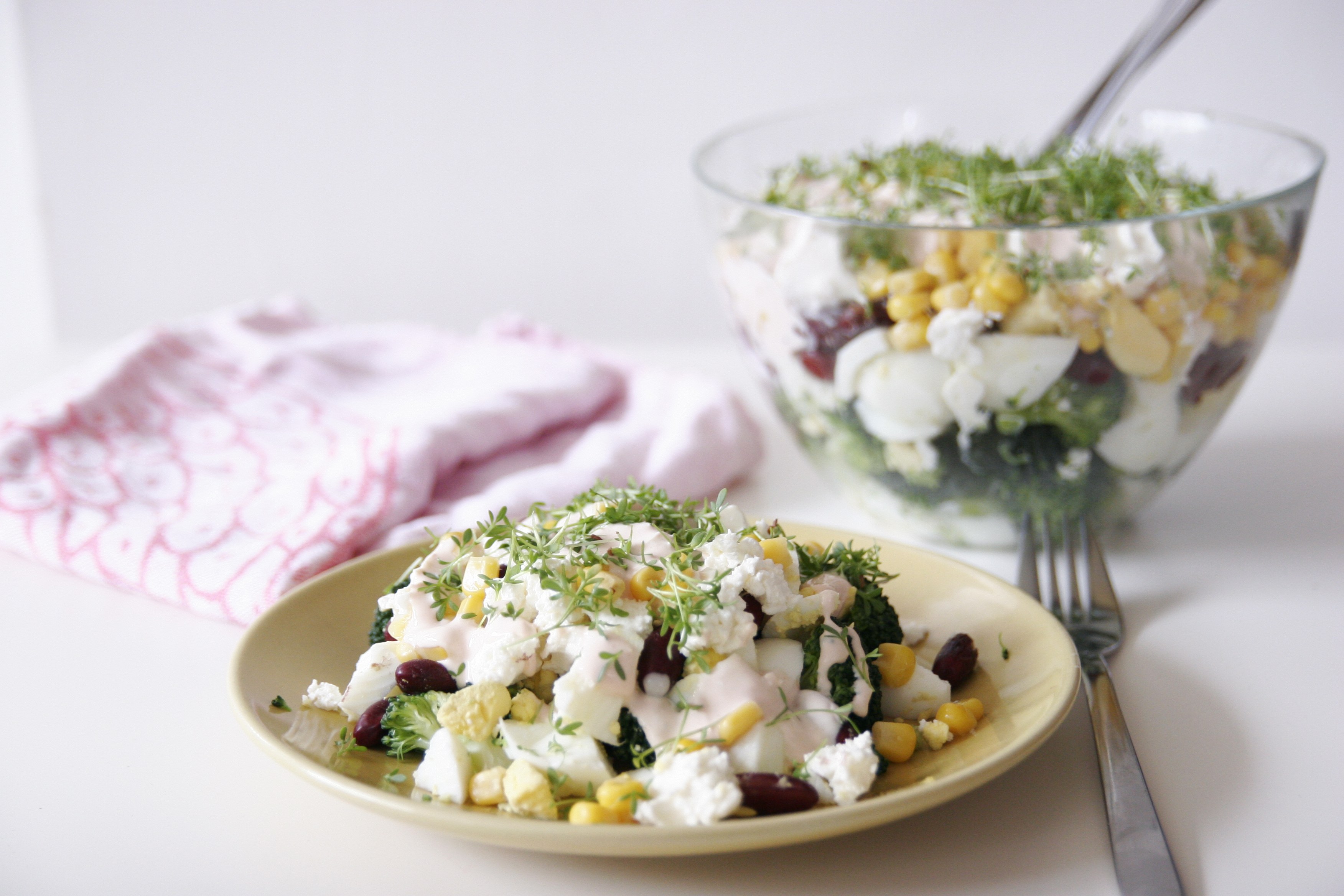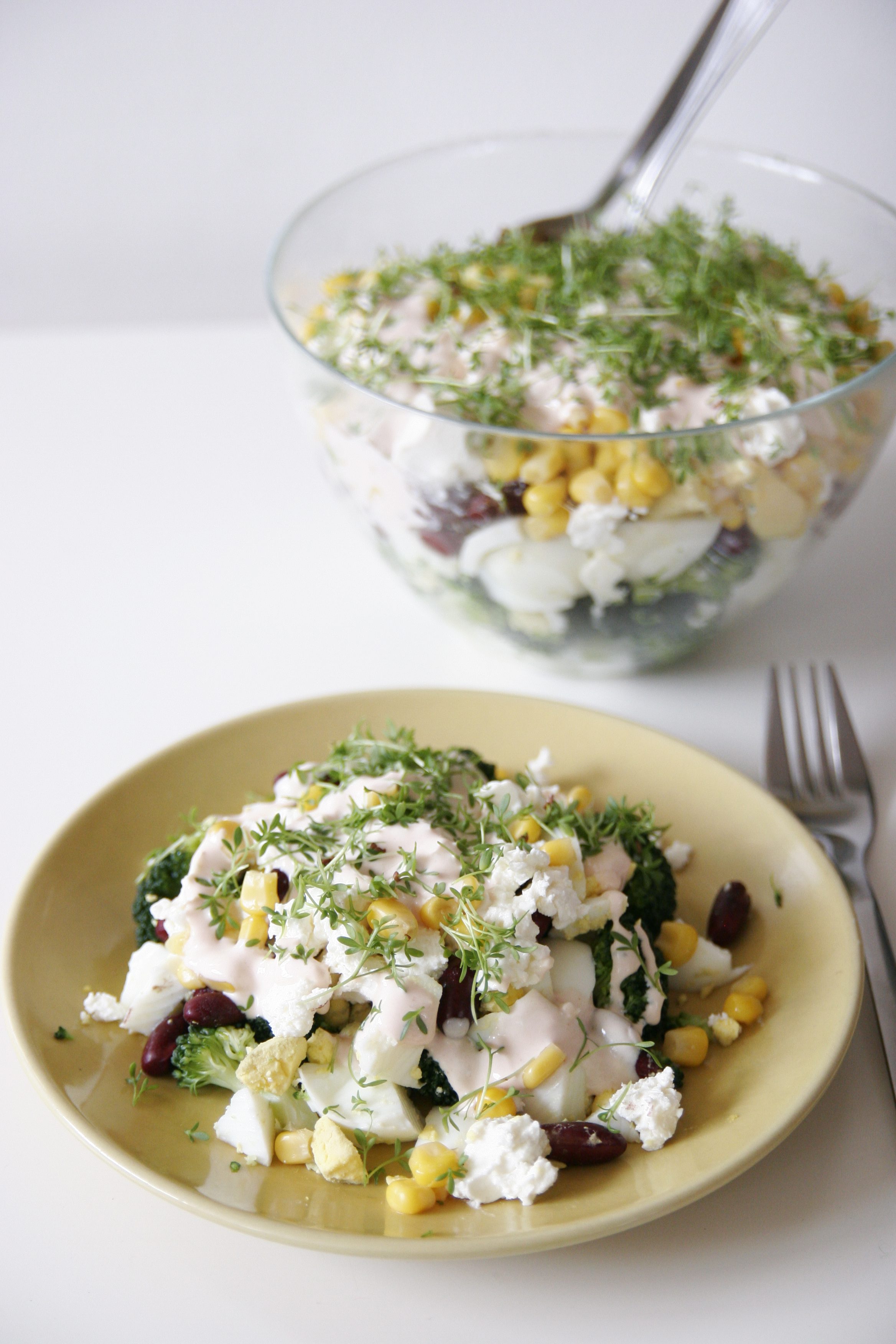 - W misce układamy na przemiennie: brokuły, jajka, feta, fasolka, kukurydza, sos. Ja dodałam jeszcze świeżo ściętą rzeżuchę.