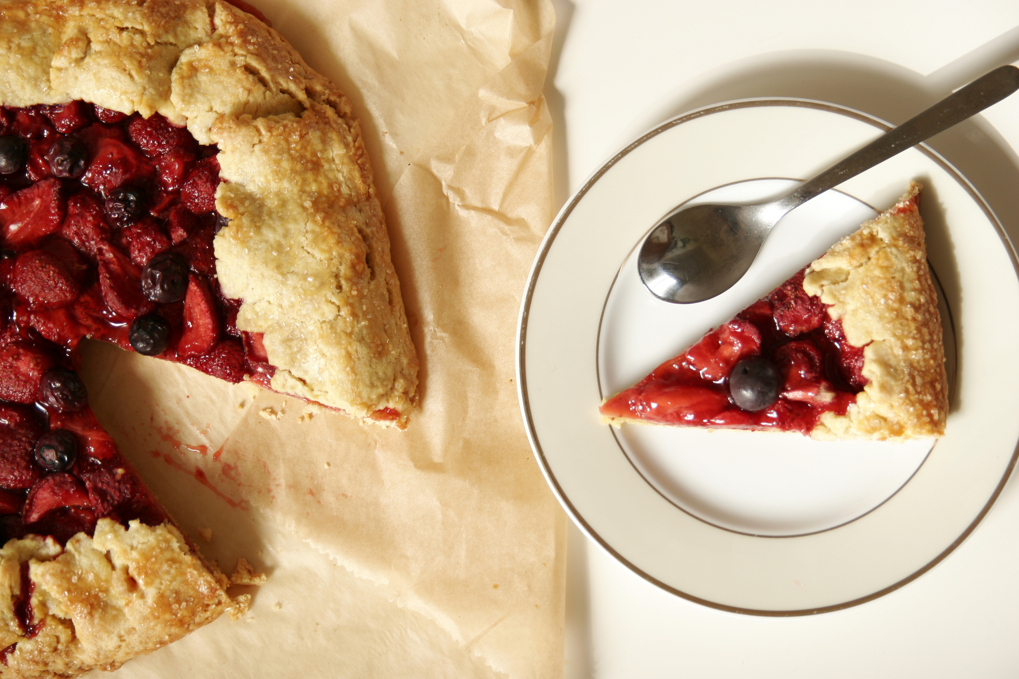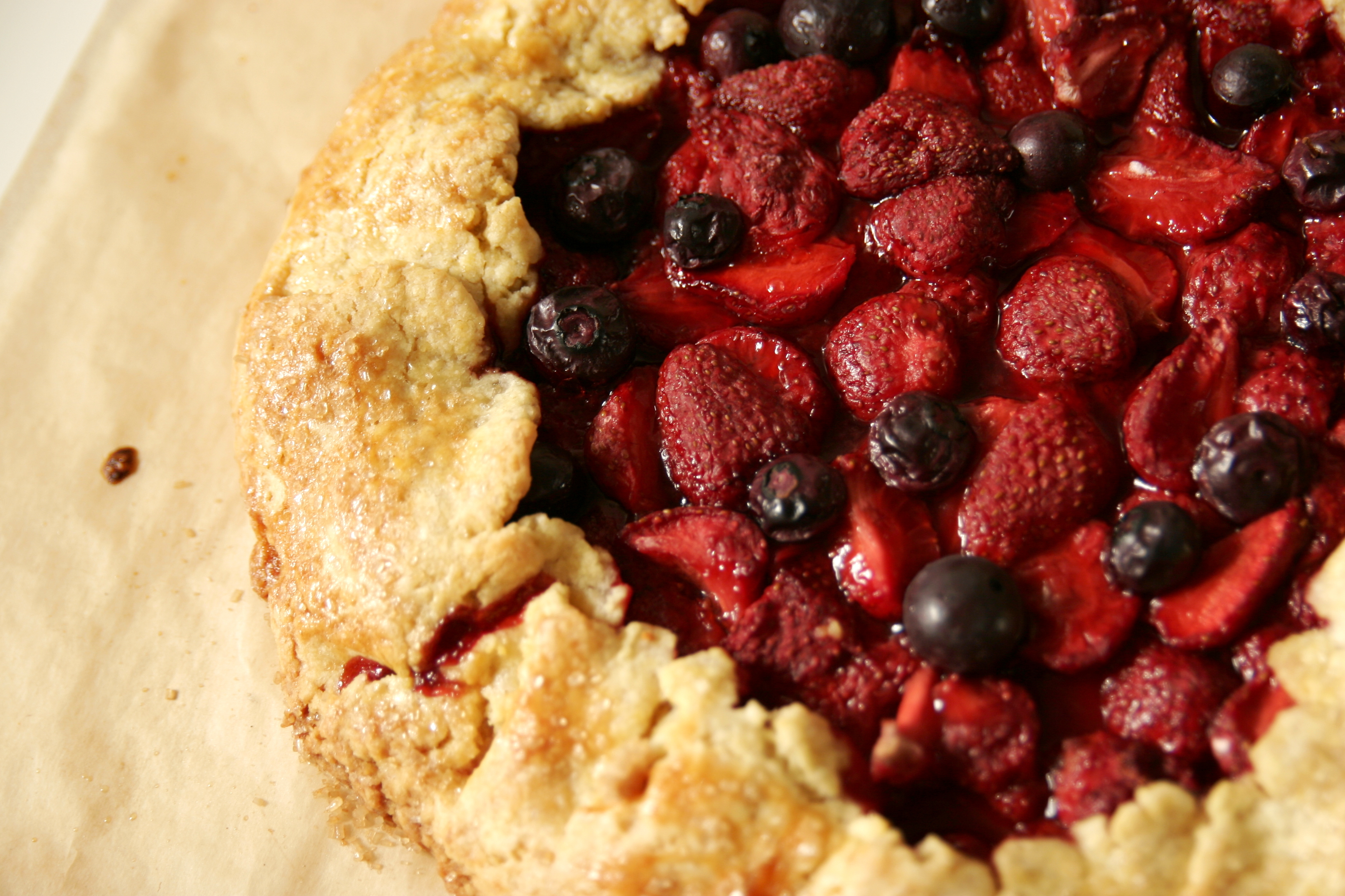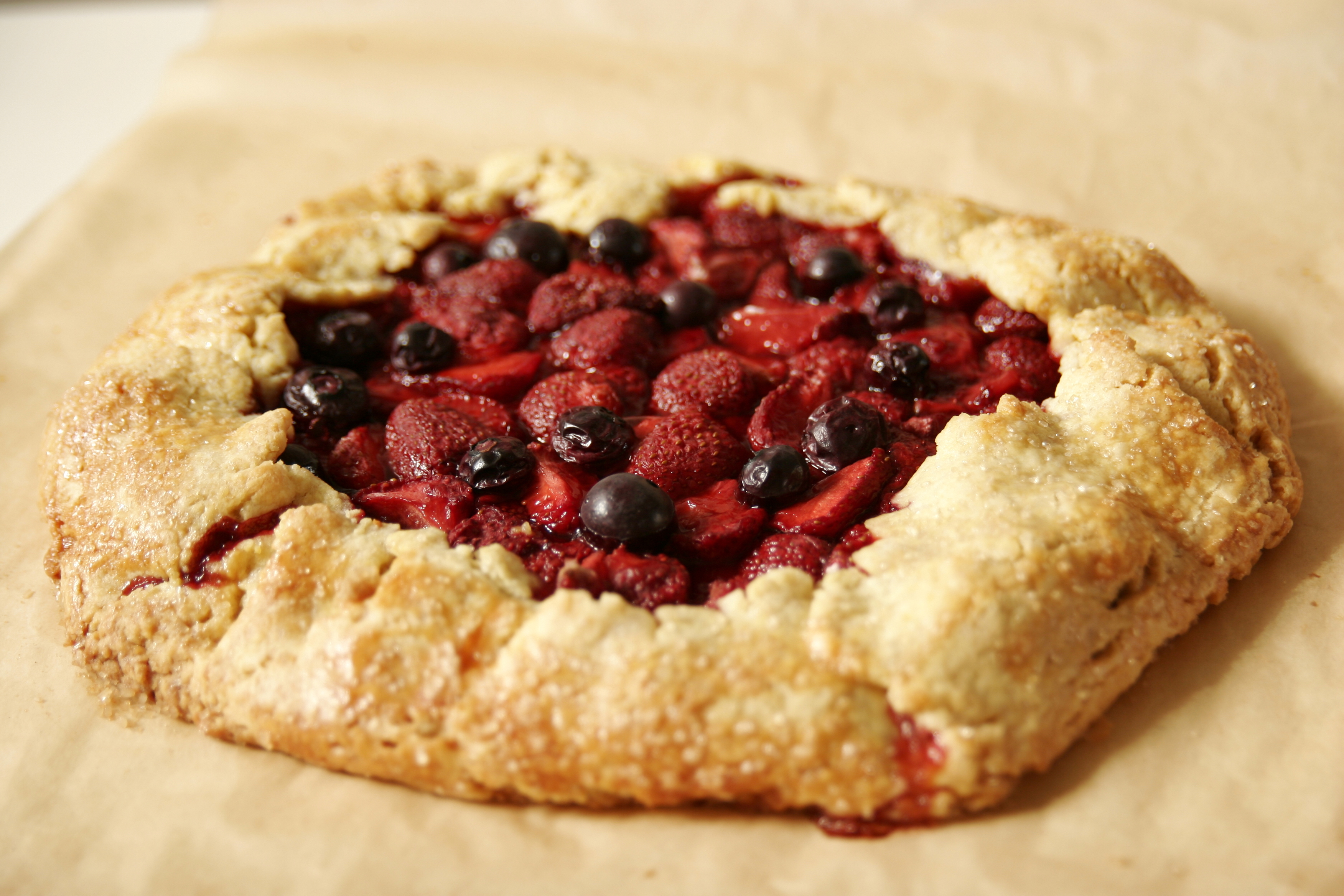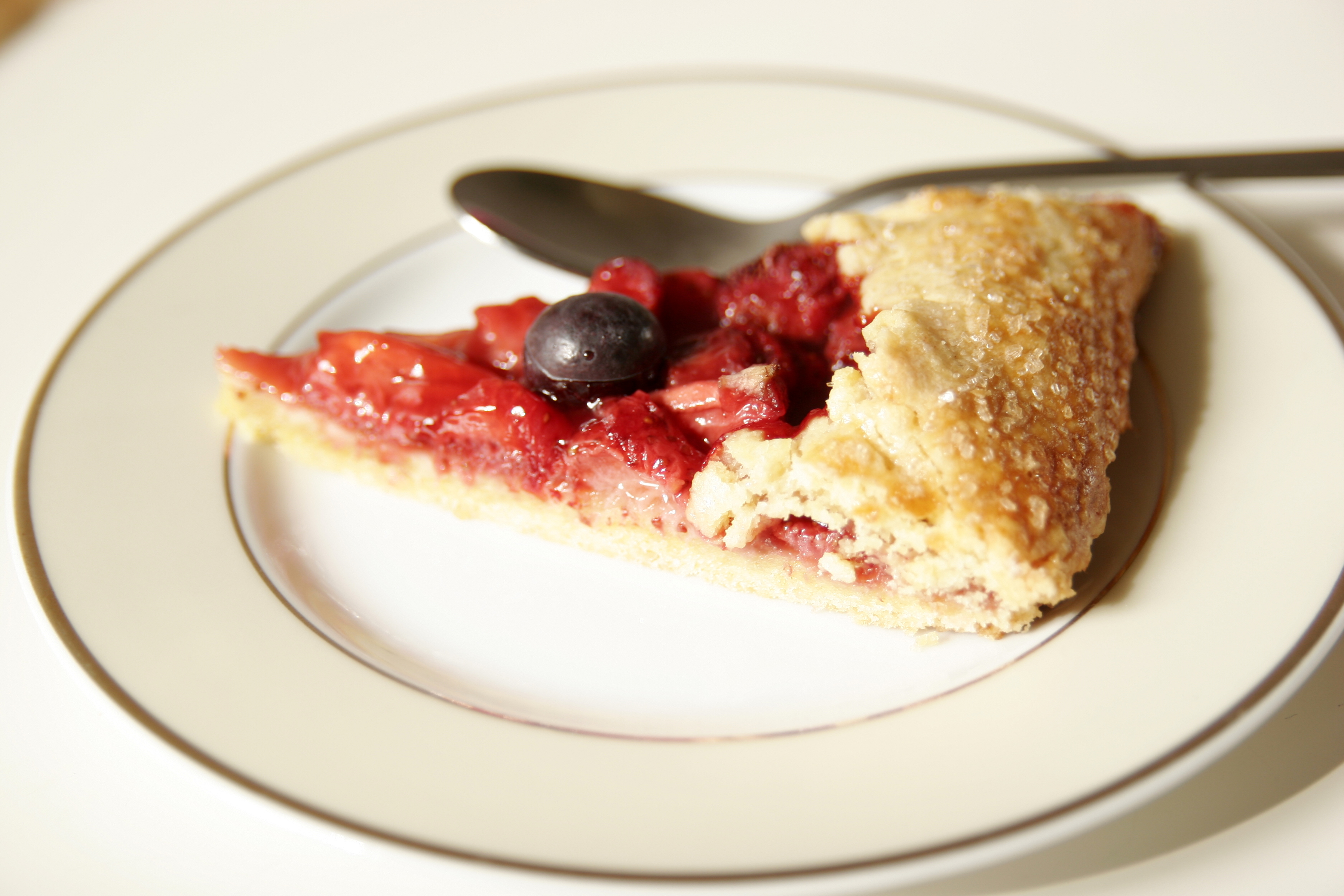 Właśnie po raz kolejny robię to ciasto. Ostatnio zrobiłam je bez okazji, ot tak do popołudniowej niedzielnej kawki, dziś już na specjalne zamówienie z okazji imprezy rodzinnej. Pierwsza, której zdjęcie widzicie poniżej miała być z rabarbarem, ale chyba ochotę na rabarbar poczuła większość część miasta. Za to z pobliskiego straganu uśmiechały się do mnie szeroko truskawki i to one trafiły do mojej Galette, czyli rustykalnej tarty. Niby to zwykła tarta, ot kruchy spód i na górze owoce, ale to własnie brak ciężkiego kremu sprawia, że smakuje lekko i owocowo, a przy tym do jej pieczenia nie potrzeba żadnej formy.