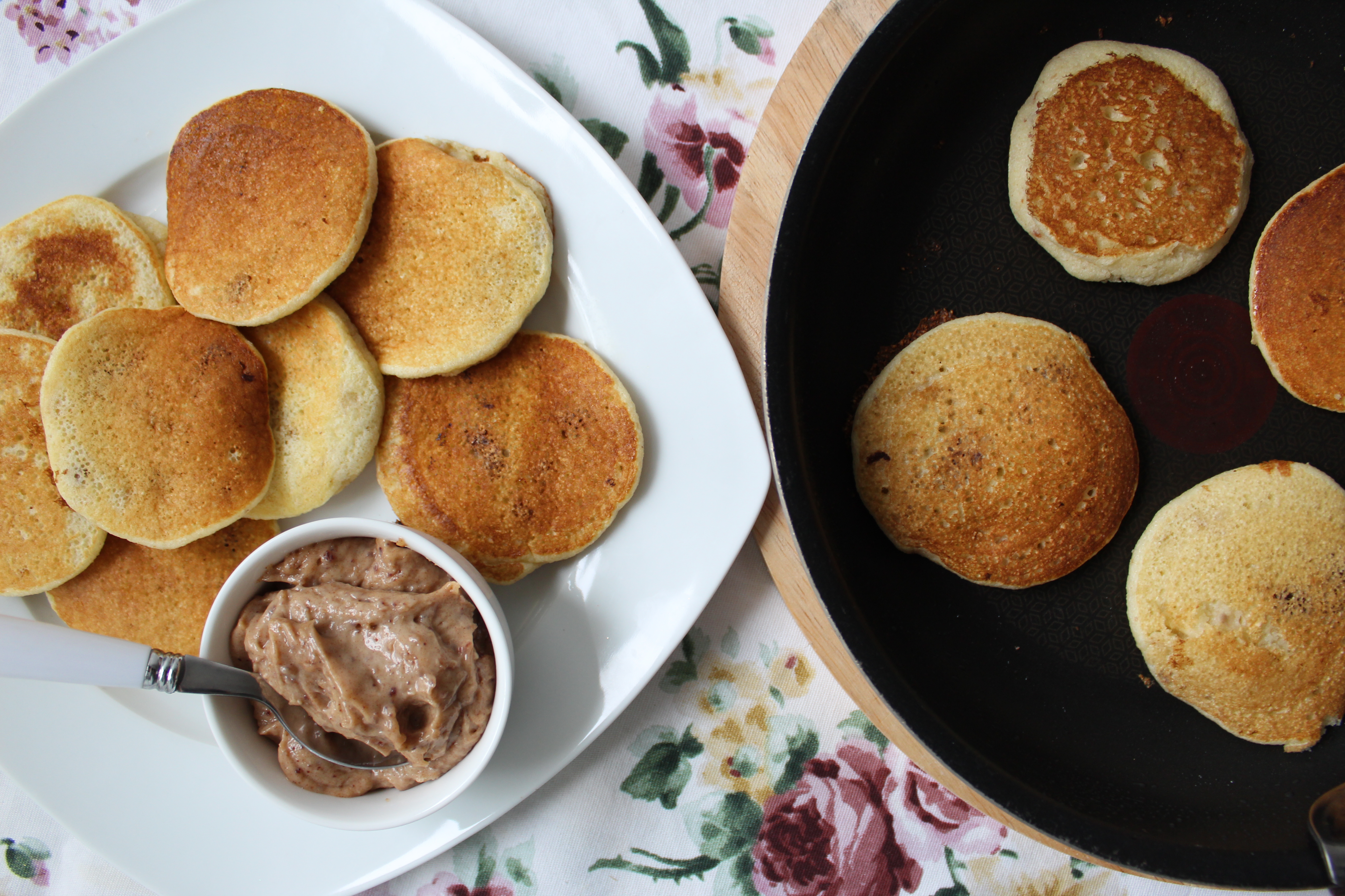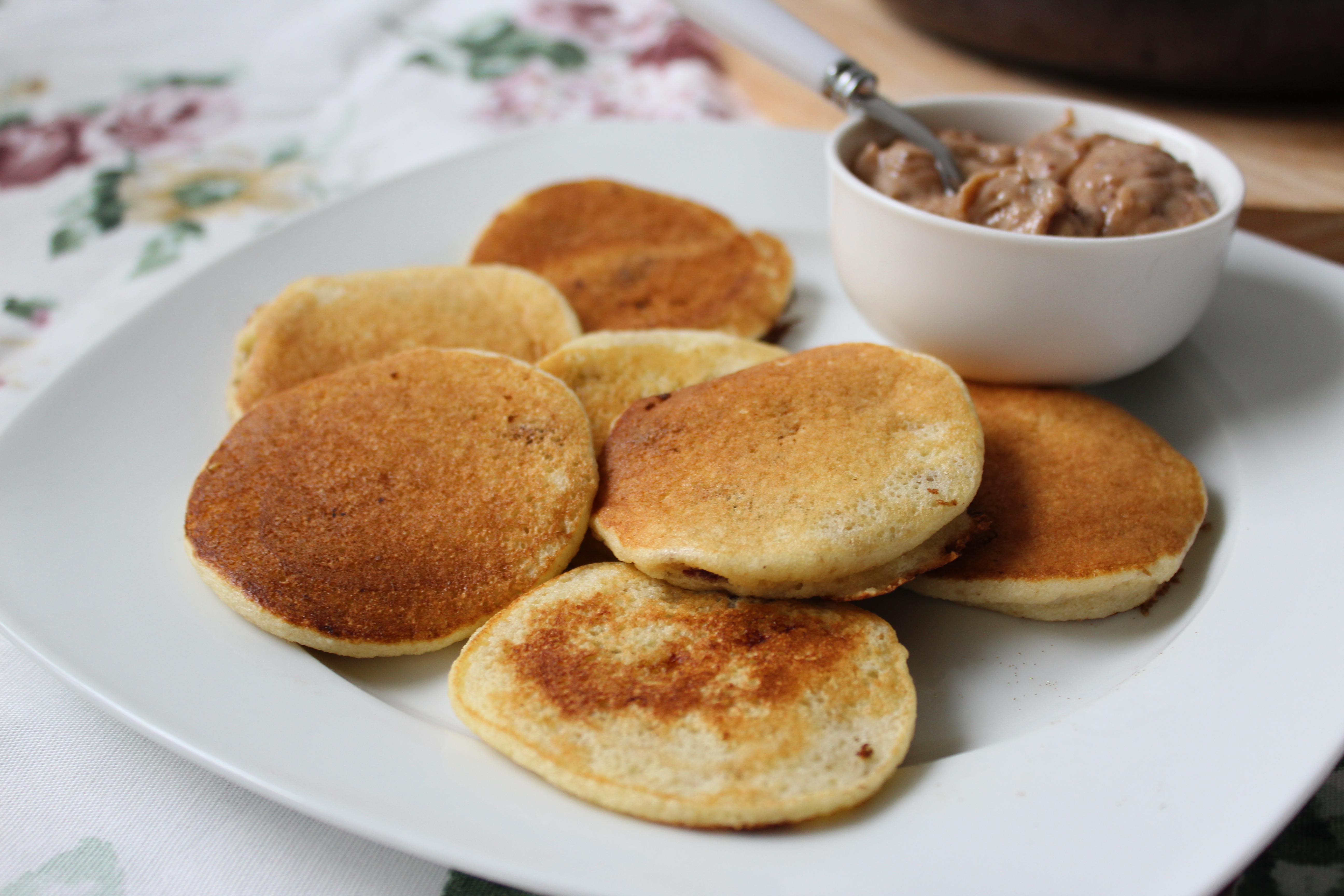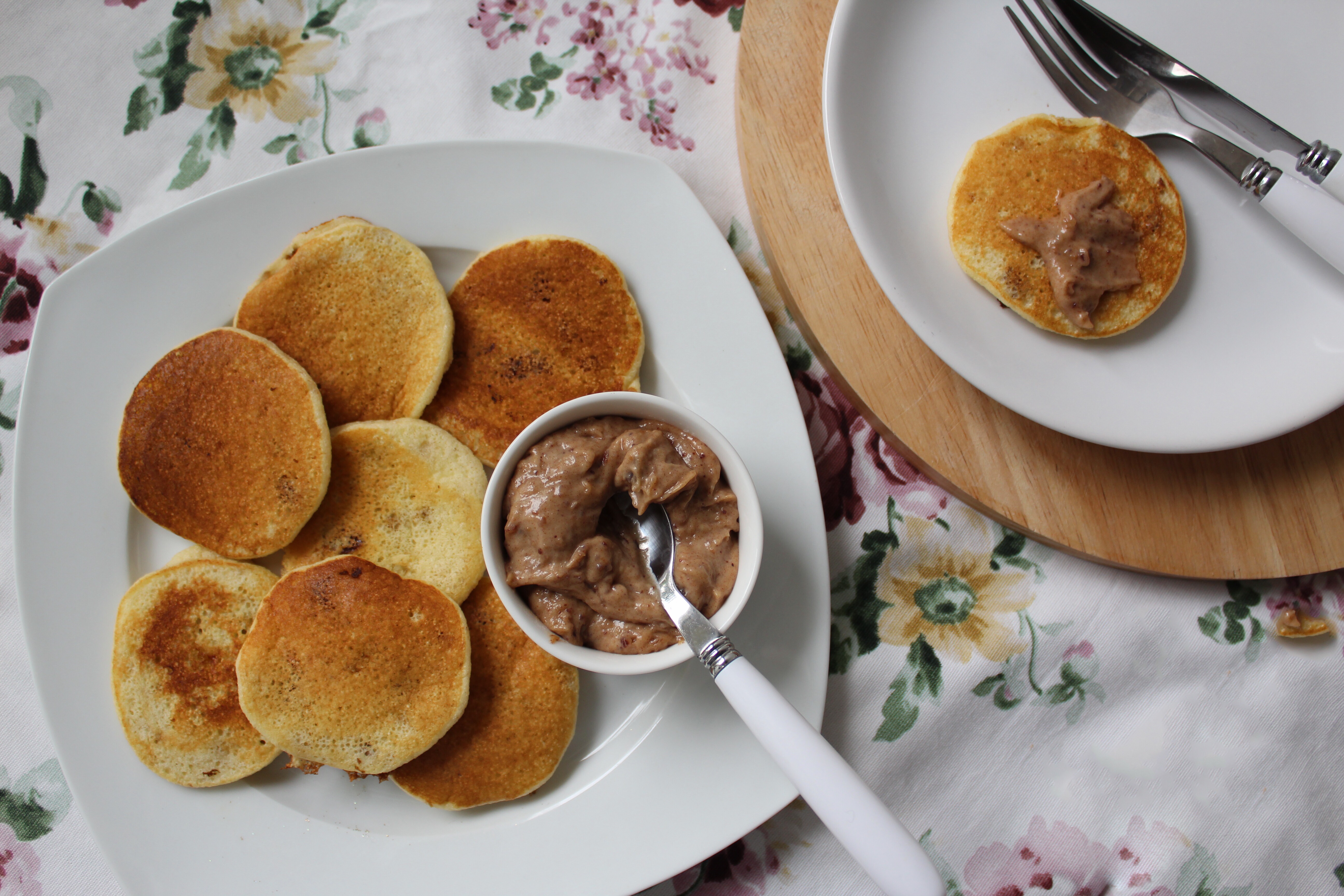 Placuszki są puszyste (za sprawą piany z białek) i baardzo słodkie dzięki dojrzałości banana i słodkich daktyli. Dzieci za nimi przepadają, a dla mnie „śniadaniowego niejadka” słodkie potrawy serwowane z rana (i to bez cukru) to spełnienie marzeń. Do placuszków podałam krem a`la solony karmel (przepis niebawem), ale placuszki były na tyle słodkie same w sobie, że jego użycie ograniczyliśmy do minimum. Z większą ochotą zużywamy go do naleśników i gofrów, które są raczej neutralne w smaku.